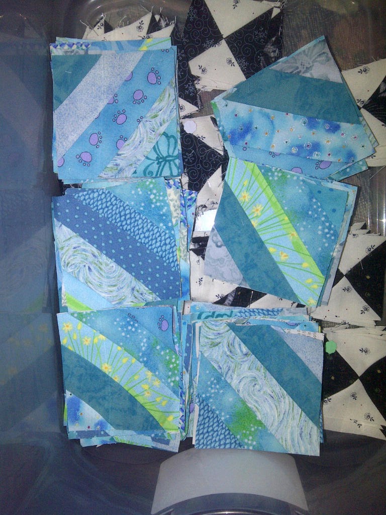 I am loving this mystery so far. All of my 224 hourglass blocks are done and I'm just over half way through the itty bitty aqua string blocks. I think I'm up to 40 something.